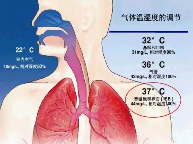 適宜濕度是我們氣道對吸入氣體進(jìn)行加溫濕化所達(dá)到的條件,通常會達(dá)到 37 °C 和 44 mg/L H2O (BTPS*)。